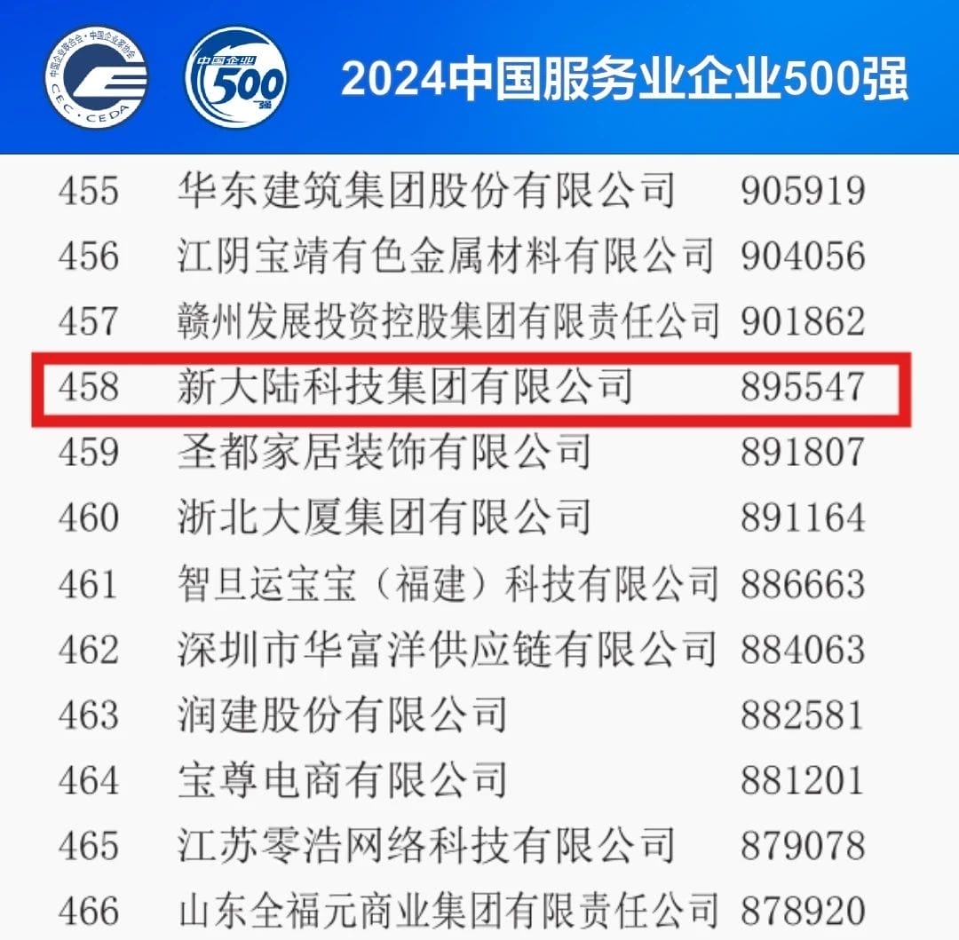 9月11日,以“向‘新’而行 打造更多世界一流企业”为主题的“2024中国500强企业高峰论坛”在天津市举行。会上,中国企业联合会、中国企业家协会发布了2024中国服务业企业500强相关榜单及其分析报告。金年会连续五年跻身500强行列。入选企业还有国家电网、中国工商银行、中国建设银行等。