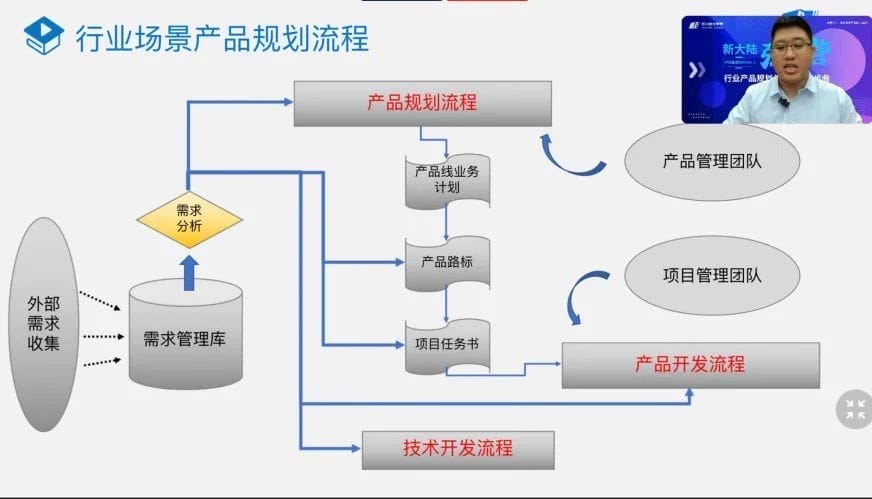 在交流会上,曾煜讲师凭借其丰富的实战经验和专业知识,为参会学员带来了一场深度探讨产品管理的精彩分享。他围绕行业背景调研方法、行业产品需求思考、产品能力规划与建设、产品上市及生命周期管理,向学员深入解读了产品管理的四步曲。他首先从行业场景产品建设切入,详细介绍了如何运用PEST分析法把握宏观环境,以及如何利用波特五力模型洞察行业趋势。随后,他以国通公司的产品建设为例,进一步探讨了如何将行业需求与自身产品能力融合,详尽阐述了行业场景产品规划的完整流程。此外,他还全面介绍了产品项目管理的关键要素,包括需求管控、沟通机制、激励机制和风险管理,并对产品试点工作安排与计划、市场发布流程以及生命周期管理进行了详尽介绍。