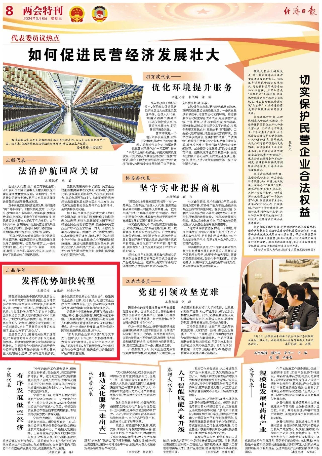 “新时代的企业家不仅要‘敢为天下先’,也要‘以天下为己任’,发扬拼搏精神,力促企业行稳致远,为企业生命注入灵魂。”王晶委员说,有了政策护航,企业家们就有信心守正创新,推进生产力升维跃迁和经济高质量发展。